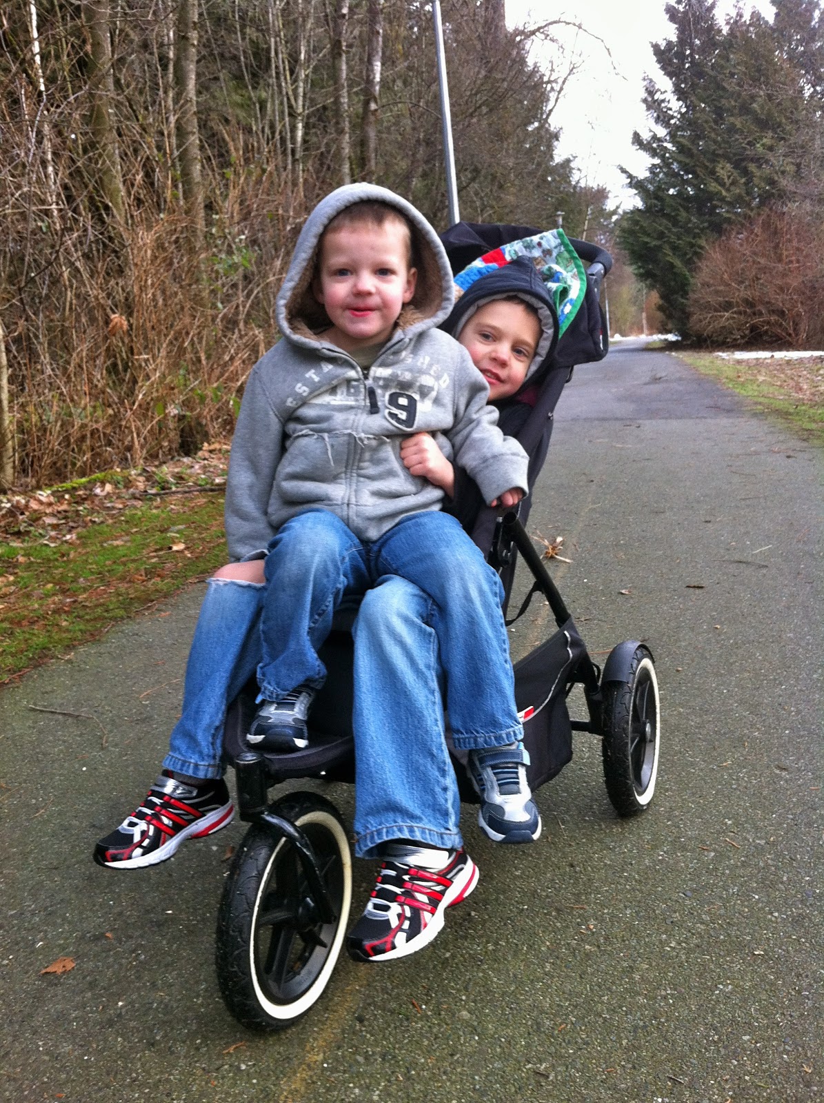 ...but he finally got tired and cold and decided to piggyback with Jaxon in the stroller. I got my exercise pushing the extra weight around the park that's for sure!
